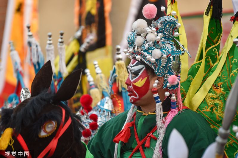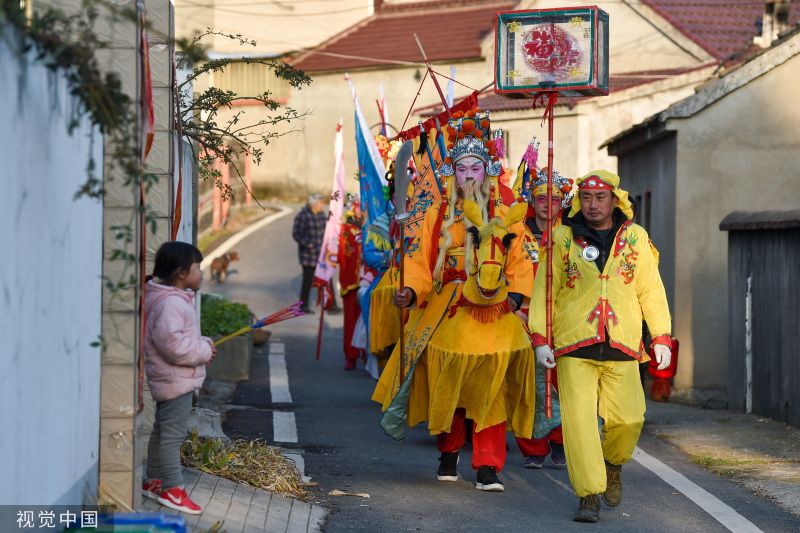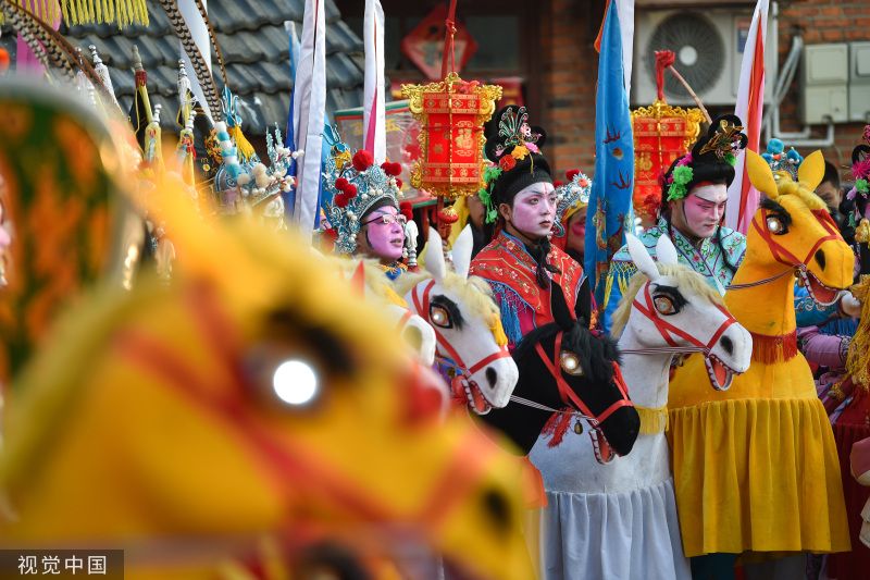 2023年1月29日,南京市,溧水区洪蓝街道青圩村举行跳马灯民俗表演,演员们身着古代戏装,伴随着铿锵的锣声,马灯队伍变化着不同的队形,人们齐聚一堂欢庆新春。