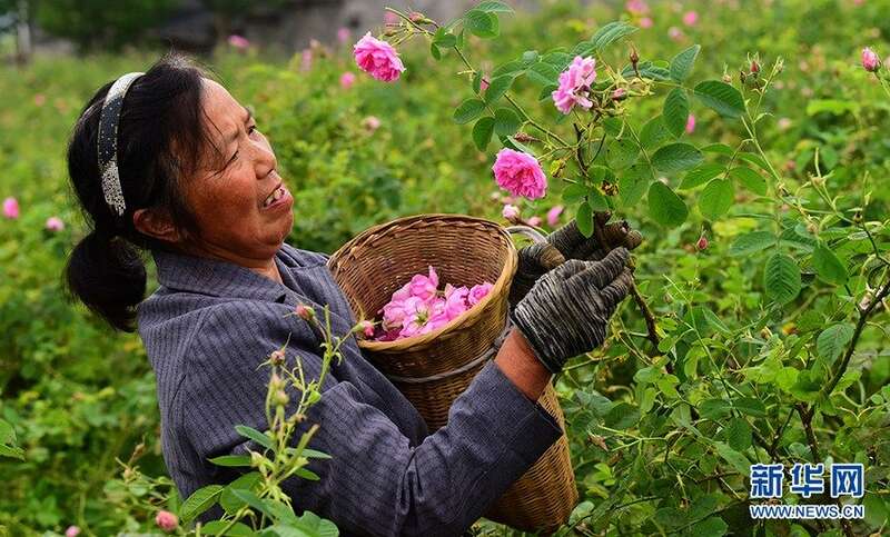 五龙坪村村民采摘玫瑰花。新华网发 李维君摄