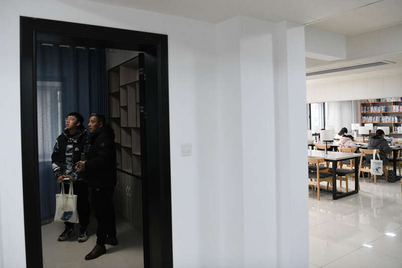 2月1日,在安徽省六安市舒城县,郭昊(左一)来到当地政府为他免费提供的媒体创意工作室。