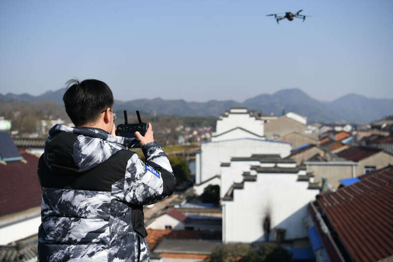 1月30日,郭昊在安徽省六安市舒城县汤池镇利用无人机航拍器拍摄小镇风景。