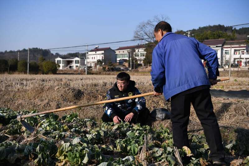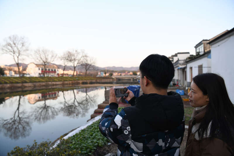 1月31日,郭昊(左)在安徽省六安市舒城县汤池镇拍摄家乡风景,妈妈汪学年在一旁陪伴。