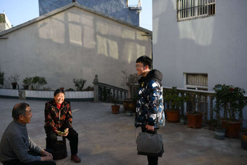 1月31日,郭昊(右)在安徽省六安市舒城县汤池镇与当地村民交流。