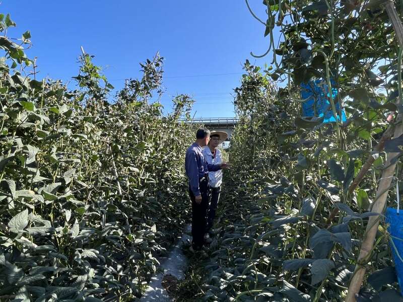 易克贤(左)和张起恺(右)在豇豆田讨论病虫害防治方案。新华社记者罗江 摄