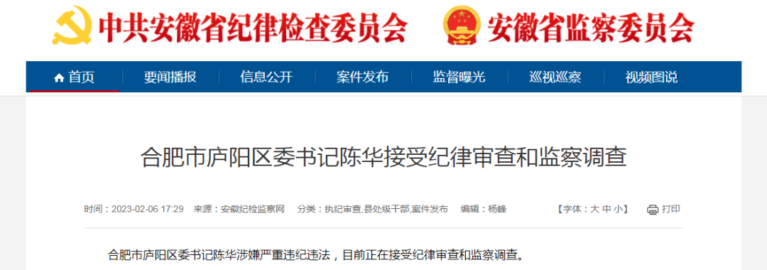 合肥市庐阳区委书记陈华涉嫌严重违纪违法,目前正在接受纪律审查和监察调查。