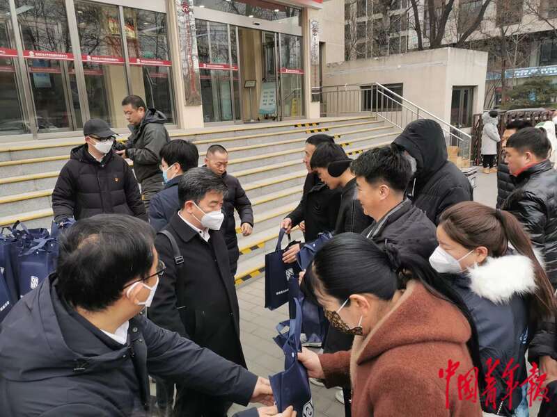 2月9日,北京海淀区北太平庄街道便民服务中心,海淀区人力社保局的工作人员为返京人员送上生活用品。中青报·中青网记者 张艺/摄
