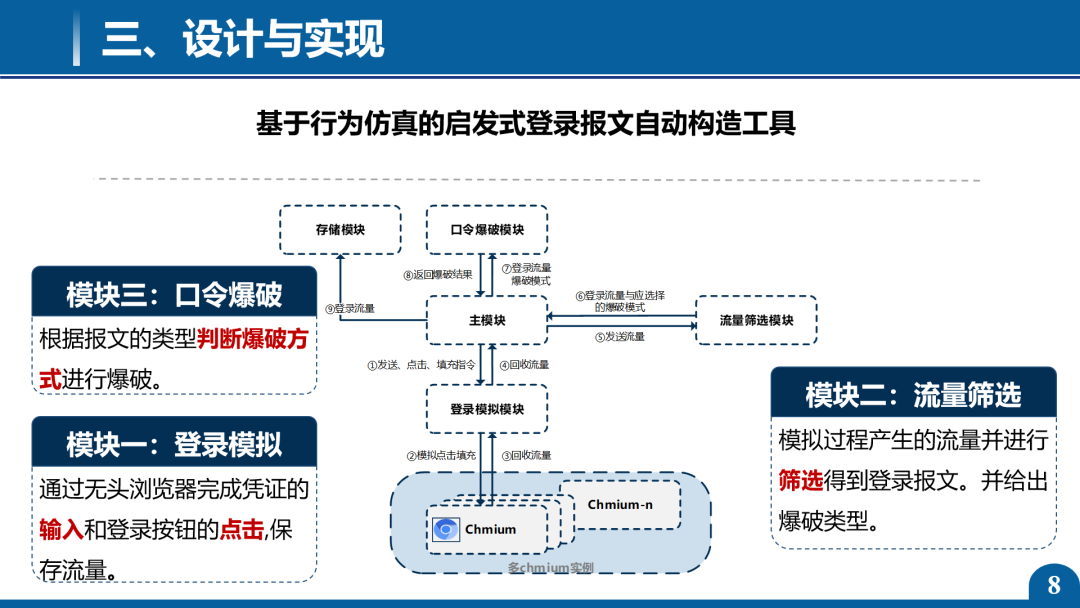 启发式登录报文自动构造工具泛用性强,通过行为仿真技术实现,突破了对网页代码的传统分析方法,在用户界面进行报文抓取,简化了操作流程,在大容量样本的数据集上,准确率为91.2%,误报率为1.1%。同时也实现了修改报文和使用行为仿真两种不同的口令猜解方式,在数据集使口令猜解效率提高了37%。