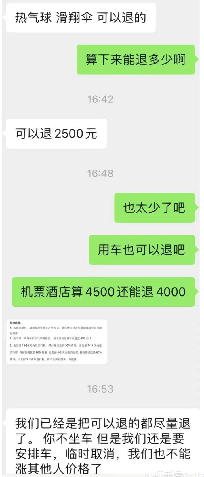 杨思思与旅行社工作人员的聊天截图显示,旅行社可退费2500元,包括一段开塞利起飞的航班机票及热气球、滑翔伞项目费用,其余机票、用车费用及住宿费用不可退。工作人员解释,根据约定,出发前3日内取消行程,将产生所有损失,不退款,2500元已经把能退的都尽量退了,因为杨思思临时取消行程,但其他参团的人也要用车,旅行社不能因为给她退费临时给别人涨价。
