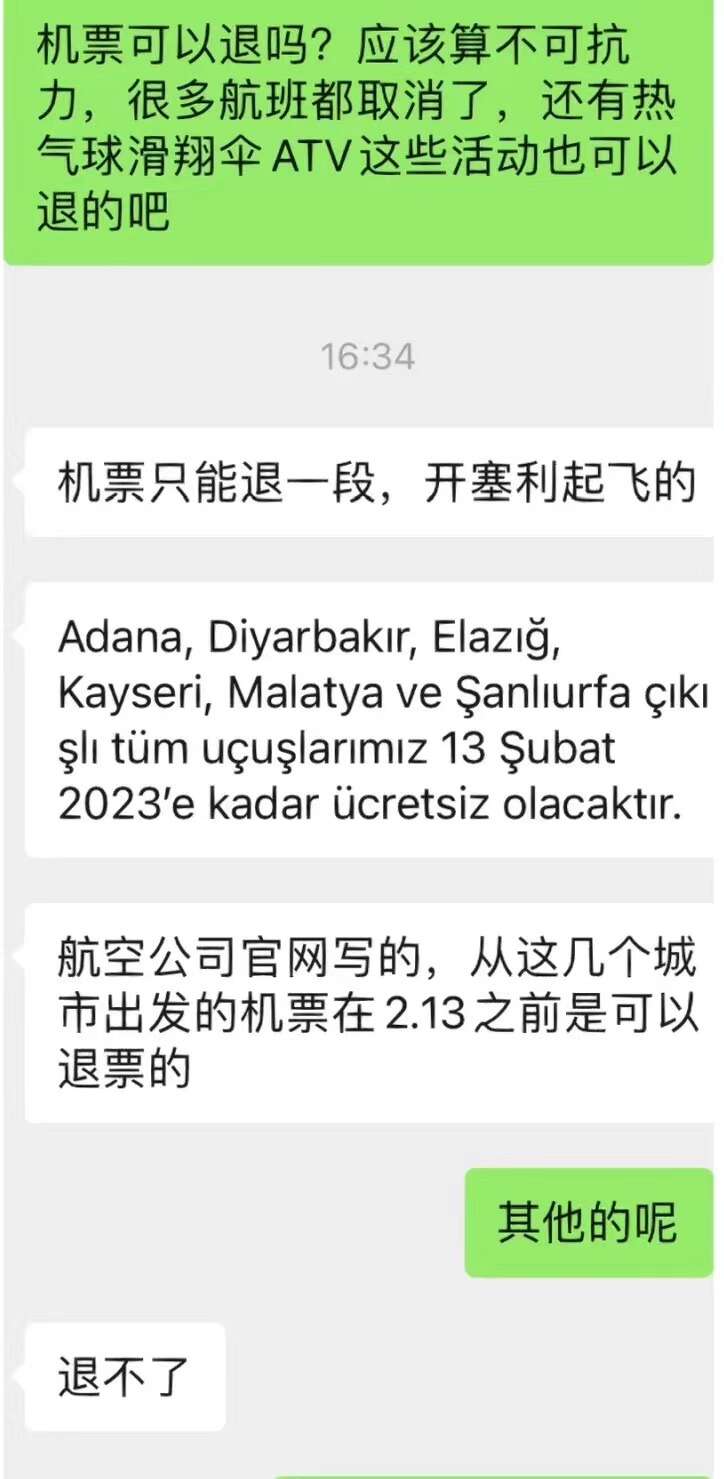 2月10日晚,杨思思告诉北青报记者,她在英国留学,今年1月底,报名参加土耳其7日跟团游,交了8500元的团费,原计划是她自己买从伦敦到伊斯坦布尔的往返机票,2月9日在伊斯坦布尔跟团出发,行程涉及伊斯坦布尔、卡帕多奇亚、安塔利亚、费特希耶等城市。团费包含土耳其境内3段航班机票、全程6晚酒店住宿、部分餐食、用车、导游及滑翔伞、热气球等游玩项目。2月6日,土耳其地震发生后,她决定取消此次跟团游行程,但没想到团费只能退2500元。
