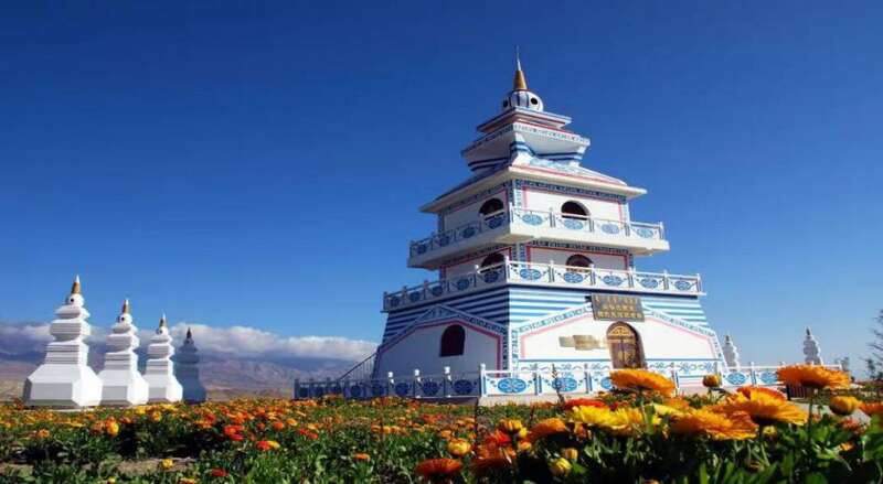 察哈尔西迁戍边纪念塔是由黄、蓝、白、红四种颜色装饰的建筑物,一旁的八座小塔,分别代表察哈尔蒙古的正黄、正蓝、正白、正红、镶黄、镶蓝、镶白、镶红八旗。