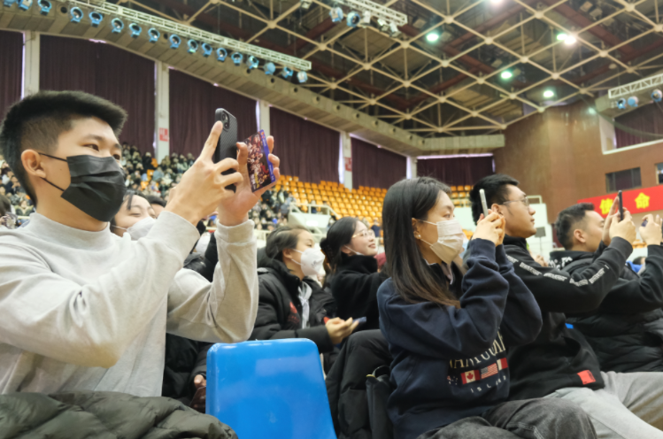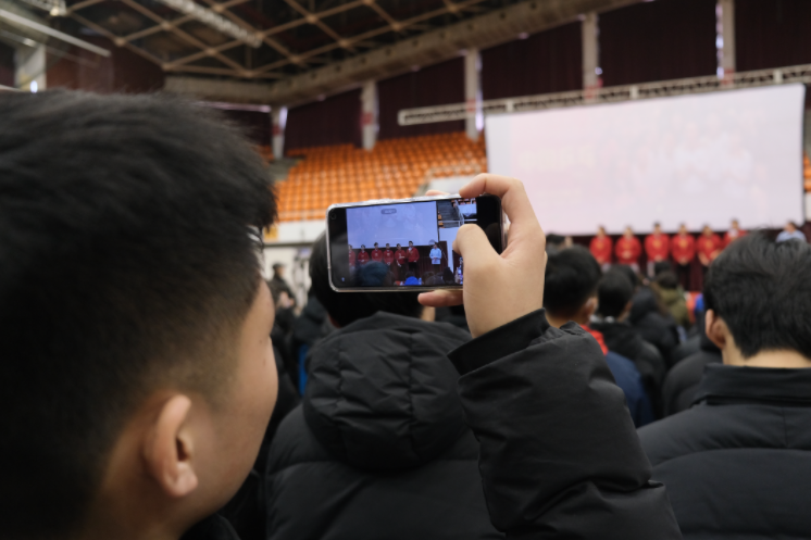 2月15日,北京体育大学,一位学生用手机记录下电影主创团队。(中青报·中青网记者 尹希宁/摄)