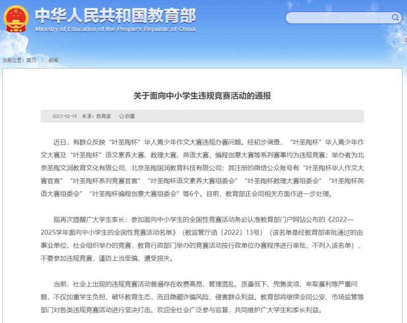 近日,有群众反映“叶圣陶杯”华人青少年作文大赛违规办赛问题。经初步调查,“叶圣陶杯”华人青少年作文大赛及“叶圣陶杯”语文素养大赛、数理大赛、英语大赛、编程创意大赛等系列赛事均为违规竞赛;举办者为北京圣陶文润教育文化有限公司、北京圣陶国润教育科技有限公司;其注册的微信公众账号有“叶圣陶杯华人作文大赛官宣”“叶圣陶杯系列竞赛官宣”“叶圣陶杯语文素养大赛组委会”“叶圣陶杯数理大赛组委会”“叶圣陶杯英语大赛组委会”“叶圣陶杯编程创意大赛组委会”等6个。目前,教育部正会同相关方面作进一步处理。