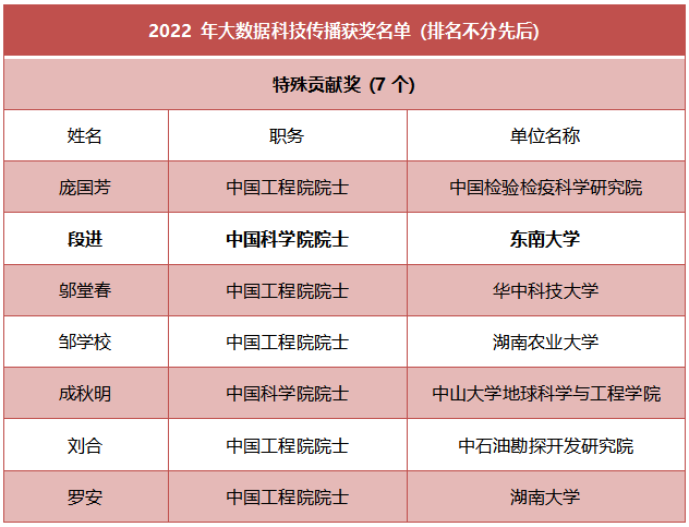 2022年大数据科技传播奖评选活动由中国科技新闻学会、湖南省科协、衡阳市人民政府联合开展,经郭华东、李兰娟、褚君浩等院士担纲的大数据科技传播奖评审委员会严格评选审定,评出特殊贡献奖 7名,作品奖9件,团体奖13个,个人奖28名。