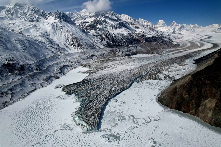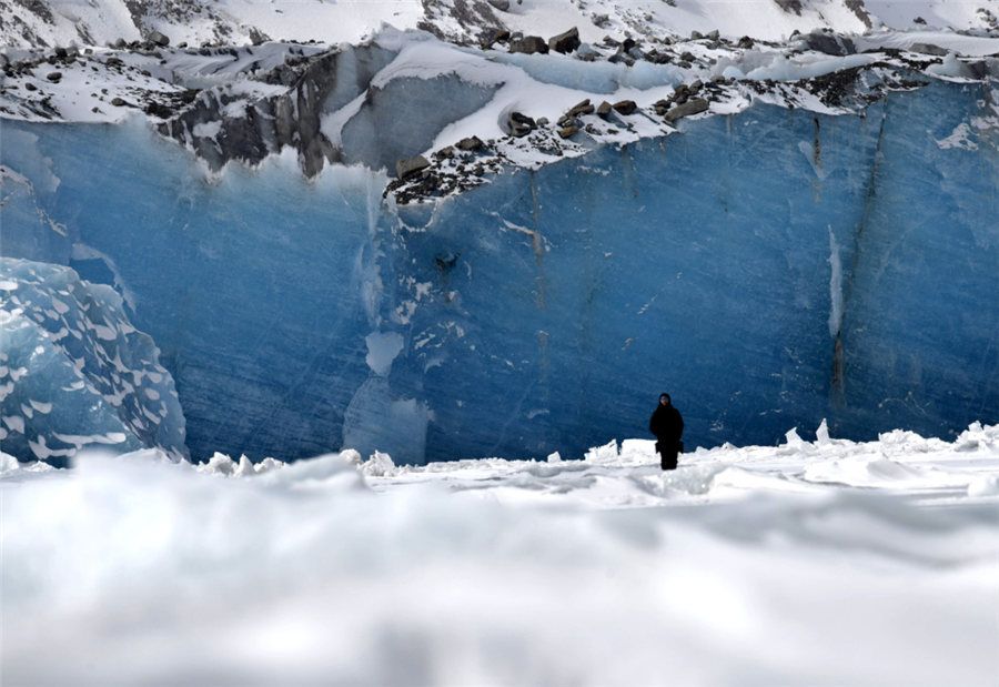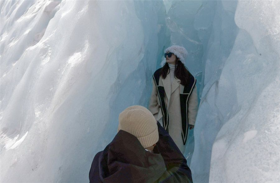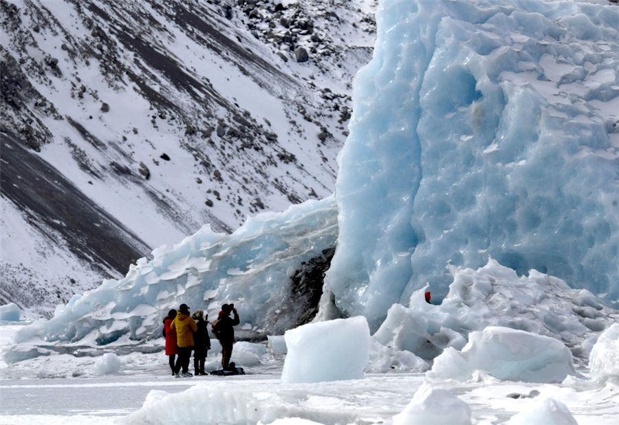 2023年2月16日,西藏昌都,游客参观来古冰川。该冰川属海洋性冰川,为一组冰川的统称,是帕隆藏布江的源头。冬天的来古冰川在阳光下显出蓝色,吸引众多游客前来观赏。中新社记者 李林 摄