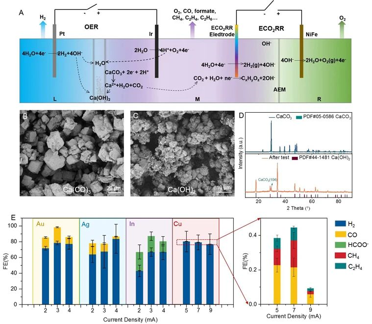 首先,本工作基于中性水分解反应体系对CaCO3进行处理转化。此过程利用中性水分解反应中析氧反应过程产生的氢离子(H+)与CaCO3反应生成钙离子(Ca2+)及二氧化碳,Ca2+与体系中生成的氢氧根(OH-)结合形成Ca(OH)2,可直接用于水泥生产。其次,通过切换施加电压,将体系中生成的二氧化碳原位转化成有价值的碳质产物,如一氧化碳、甲烷、烯烃等,反应产物可以通过调换催化剂实现调控。