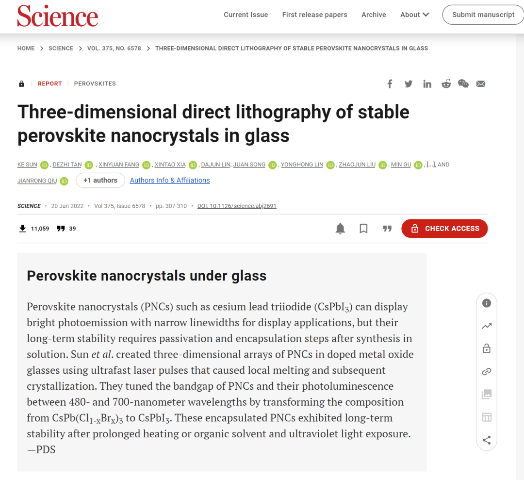 个人介绍:孙轲,浙江大学光电科学与工程学院电子与信息专业2019级博士生,师从浙江大学光电科学与工程学院微纳光子学研究所所长邱建荣,研究方向为超快激光微纳制造。 博士阶段以第一作者在Sicence等期刊发表论文5篇,获得竺可桢奖学金,博士研究生国家奖学金等奖项。 以第一作者发表的Sicence论文成果获得Science当期封面推荐,同时被科技日报,科学网,中国青年网,中国新闻网,央视新闻等国内外媒体转载报道,引起广泛的讨论。