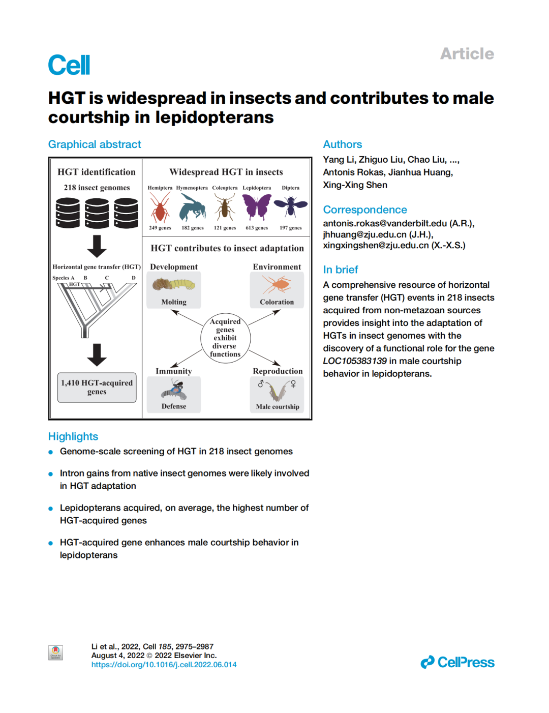 个人介绍:李杨,浙江大学农业与生物技术学院农业昆虫与害虫防治专业2021级硕博连读博士研究生,师从“百人计划”研究员沈星星,从事昆虫进化基因组学与生物信息学研究。以第一作者发表SCI论文3篇,其中最新研究成果在国际顶级期刊Cell上发表。该研究攻坚算法难题,在国际上首次揭示了昆虫繁衍的“新钥匙”,为农业害虫绿色防控提供了新思路,获得国内外媒体的广泛关注和报道。