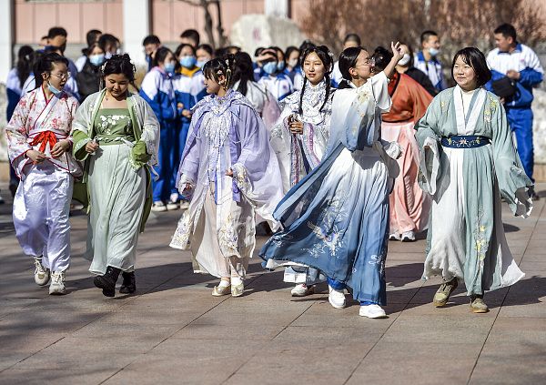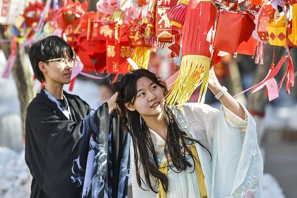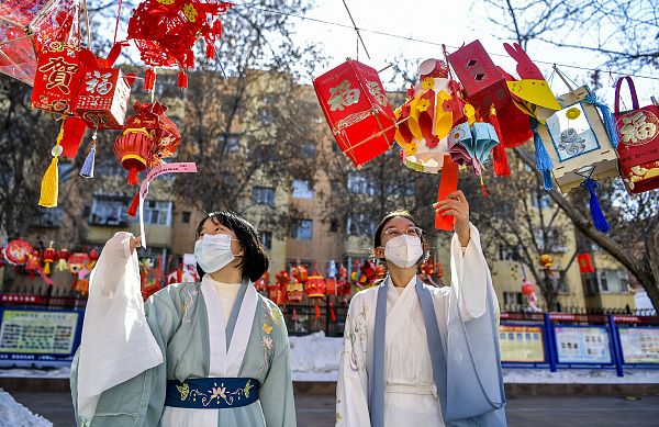 2023年2月17日,乌鲁木齐市第41中学举办“汇中华文化 传古今经典”传统文化进校园活动,校园内设置了花灯展示区、灯谜区、古诗词区等区域,学生们参与其中,学习、感受传统文化。 中新社记者 刘新 摄
