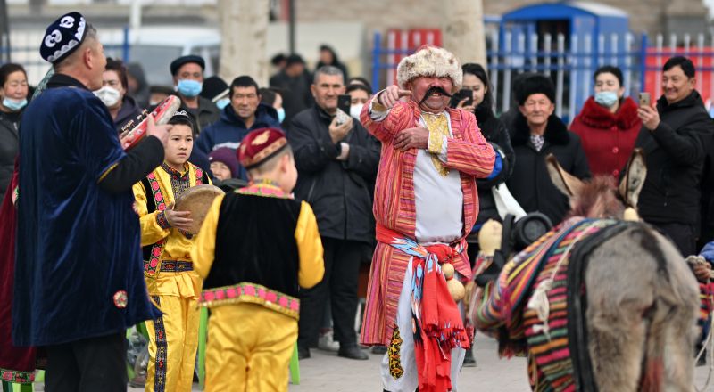 2023年2月18日,新疆库尔勒,在哈拉玉宫乡巴格吉代村“吉格代”巴扎上,村民买买提·玉山装扮成“阿凡提”巡回表演。
