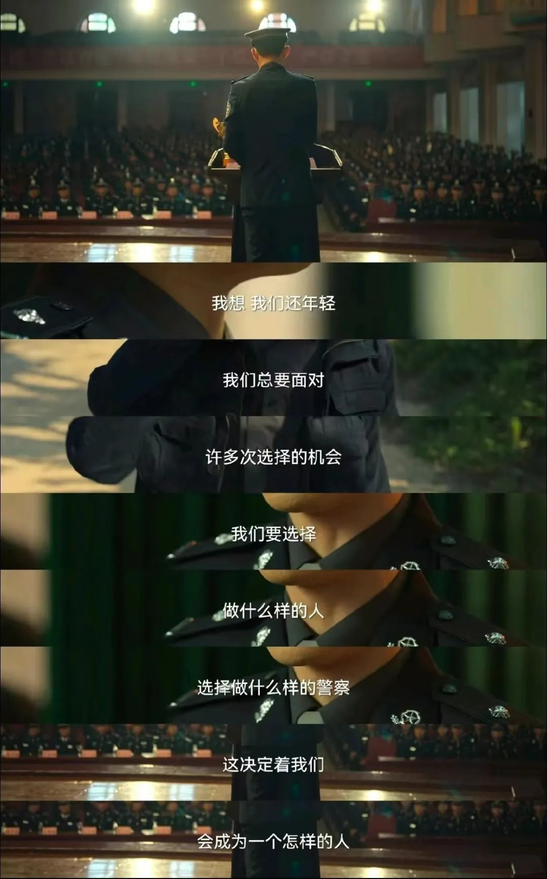 这一路上,你曾遇到他人的不解“四年大学,以后就是一个普通民警,根本不值得”,你也曾经历实习时无聊繁杂的琐碎事情的干扰,但这只是更加坚定了你从警的决心——你心中怀有正义,眼里尽是家国,因为四年的学习生活让你知道,所谓警察,便是在盛世之下,为万家灯火负重前行。不在乎旁人的视角,因为你们心中自有乾坤。你们永远都在崇拜着那些闪闪发亮的人,觉得他们像是明星一样的存在,但经历了这场考试,身为预备警官的你们同样可以拥有闪光的未来。