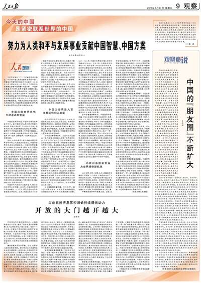 习近平主席在二〇二三年新年贺词中指出:“今天的中国,是紧密联系世界的中国。”中国的发展离不开世界,世界的繁荣也需要中国。中国始终把自身置于人类发展大潮流、世界发展大格局中,与世界良性互动、共同发展。本期观察版刊发3篇文章,阐明今日中国与世界深度交融、命运与共,中国既发展自身又造福世界;无论国际形势如何演变,中国都将坚定站在历史正确的一边、站在人类文明进步的一边,努力为人类和平与发展事业贡献中国智慧、中国方案。