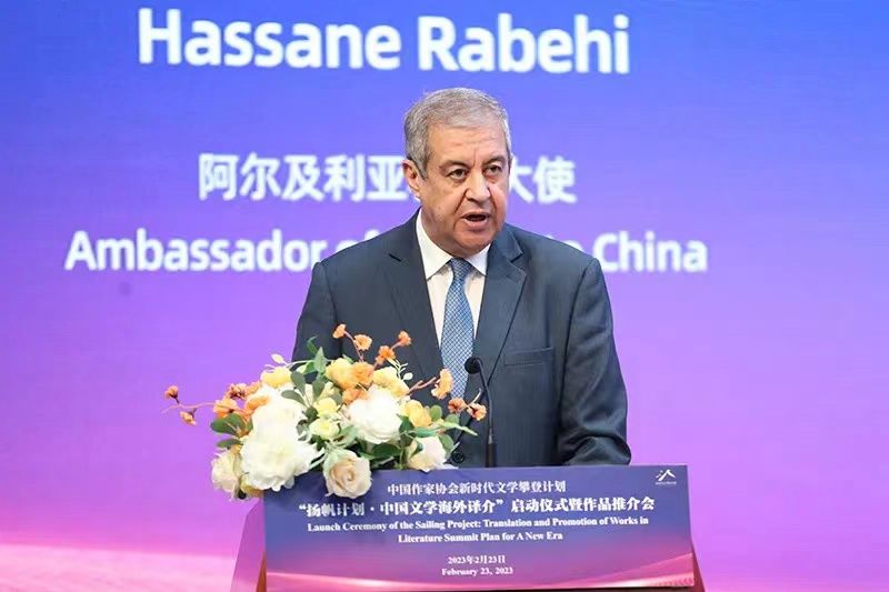 哈桑·拉贝希表示,今年恰逢中国国家主席习近平提出“一带一路”倡议十周年。这一宝贵的倡议旨在促进各国民心相通,促进和平、繁荣与合作。文学翻译具有十分重要的意义,相信“扬帆计划·中国文学海外译介”的启动将以一系列丰富多彩而优秀的翻译作品,加强各国人民之间的了解,带来丰硕的合作成果和国际凝聚力。阿尔及利亚将继续信任、鼓励并对此提供相应的支持。作为今年北京国际图书博览会的主宾国,阿尔及利亚也将积极推动阿中合作,将更多的书籍和作品翻译成中文,让中国读者更多地了解阿尔及利亚的文学和文化。
