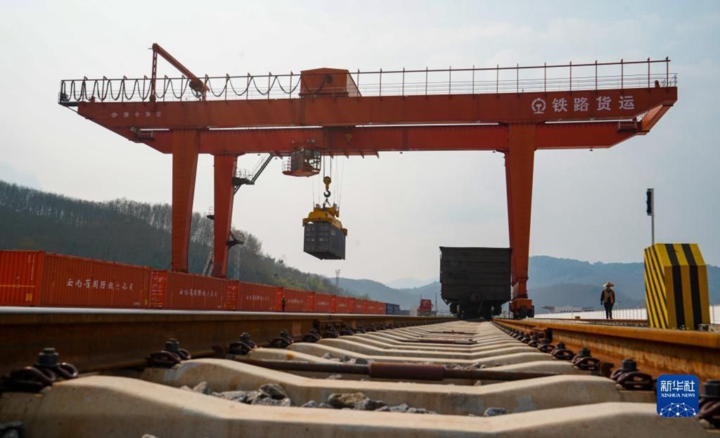 2月22日,工作人员在中老铁路磨憨站进行集装箱吊装作业。