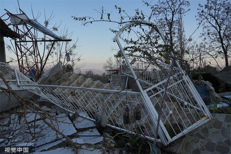当地时间2023年2月14日,土耳其哈塔伊省克勒克汉县Balarmutu村,一座房子的楼梯倒塌并扭曲。