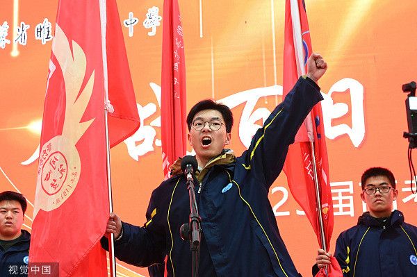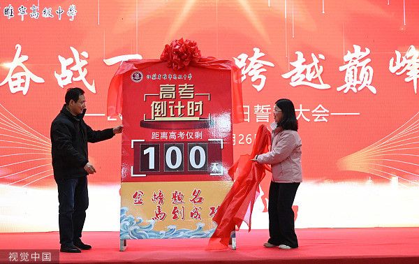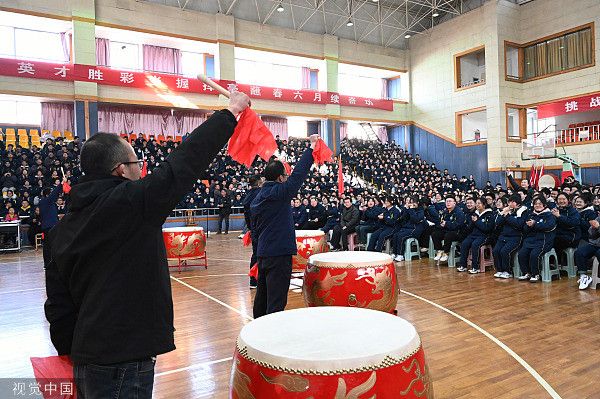 2023年2月26日,江苏徐州,睢宁高级中学举行2023届高三百日决战高考誓师大会。全校师生及部分学生家长代表参加誓师大会,一起为高三学生的百日冲刺壮行。
