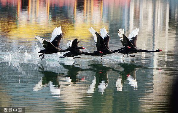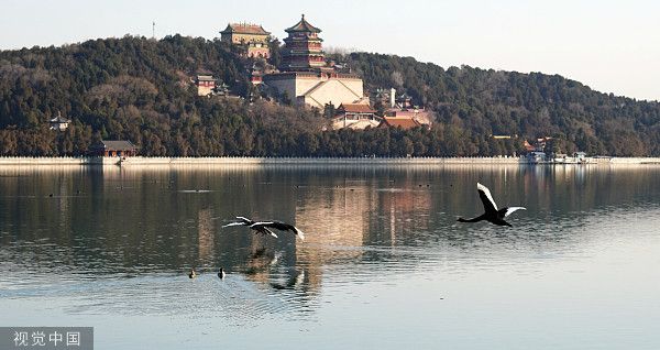 北京:颐和园春意渐浓 黑天鹅戏水报春来