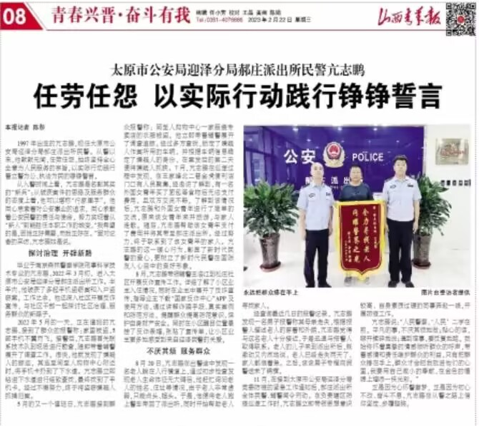 编者按:亢志鹏,男,中共党员,我院2021届毕业生,2021年1月参加工作,现任山西省太原市公安局迎泽分局郝庄派出所一级警员。日前,《山西青年报》深入报道了他从警以来,默默无闻,任劳任怨,始终坚持全心全意为人民服务的宗旨,以实际行动践行着立警为公、执法为民的铮铮誓言。
