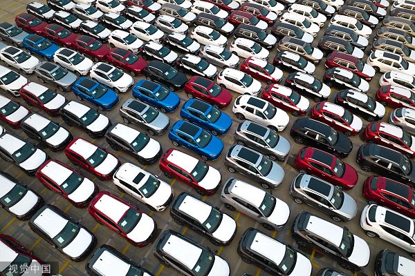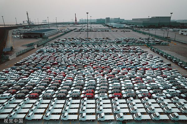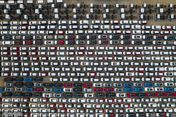 上海:出口汽车停车场内整齐排列 等待上船出口售卖