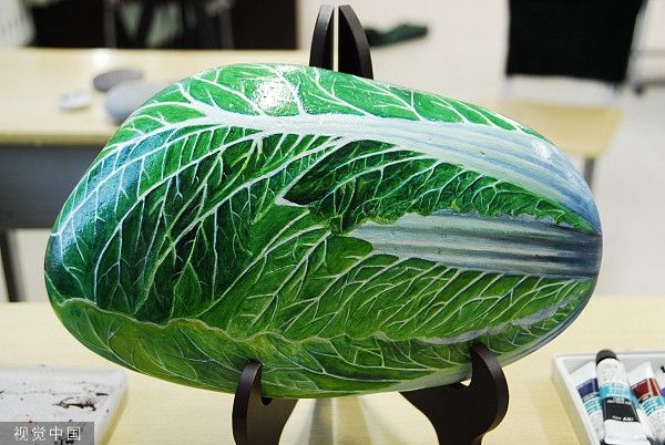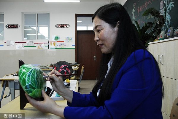 2023年3月1日,黑龙江黑河,爱辉区瑷珲镇中心学校,孙晓丽在创作彩绘石头画。