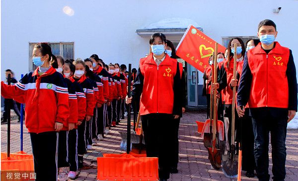2023年3月1日,新疆塔城,裕民县第一小学举行“赓续雷锋精神,争做时代先锋”学雷锋活动月启动仪式。通过奏唱国歌、讲雷锋故事、唱雷锋歌曲、签名承诺、学雷锋服务队授旗和清雪美校园等活动,引导广大少先队员传承雷锋精神,从小学先锋、长大做先锋,努力成长为能够担当民族复兴大任的时代新人。