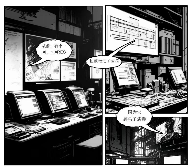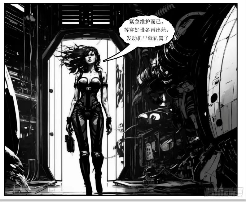从当前公开的漫画内容来看,剧情上还没有进入主线剧情,还不好说这个剧情够不够精彩,但是单从漫画的画面上来看,已经是相当流畅了,若非作者有说明过这是人类和AI合作完成的作品,几乎看不出人工智能的生成痕迹。或许是因为有人类在进行调整把控,AI绘图问题最严重的手部绘制画面在目前公开的画面中也基本是完整流畅的,人物的肢体动态到画面的构图布局都与市面上其他漫画无异。粗犷的走线在一定程度上模糊了画面部分细节,形成了类似于美式漫画的作画风格,整体来看是一篇颇为流畅的漫画。