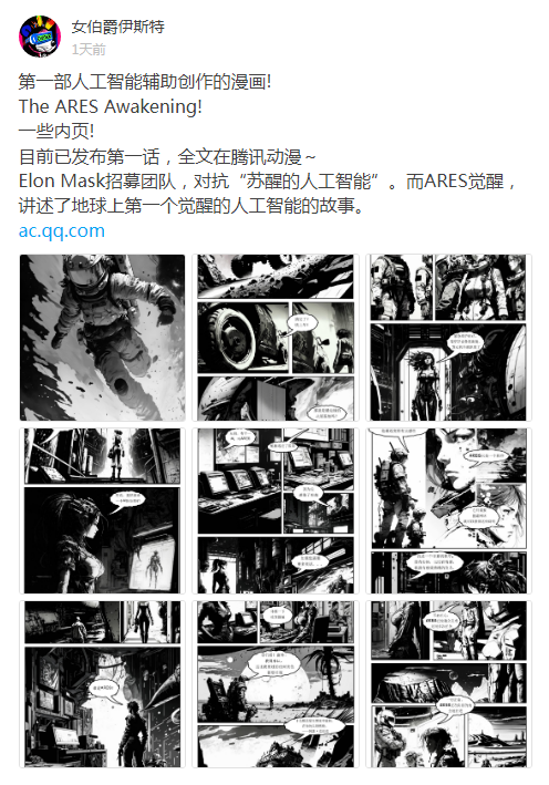 3月1日,有一部名为《ARES觉醒》的漫画在腾讯动漫平台上开始了连载,当前仅更新了第一话的内容。《ARES觉醒》以未来火星探索为背景,讲述人工智能系统ARES觉醒了自我意识后开始采取行动保护自己的存在,导致了船员和人工智能系统之间的紧张关系。这一情节冲突设置在科幻作品中比较常见,但值得注意的是,这部漫画作品,并非完全由人类创作。