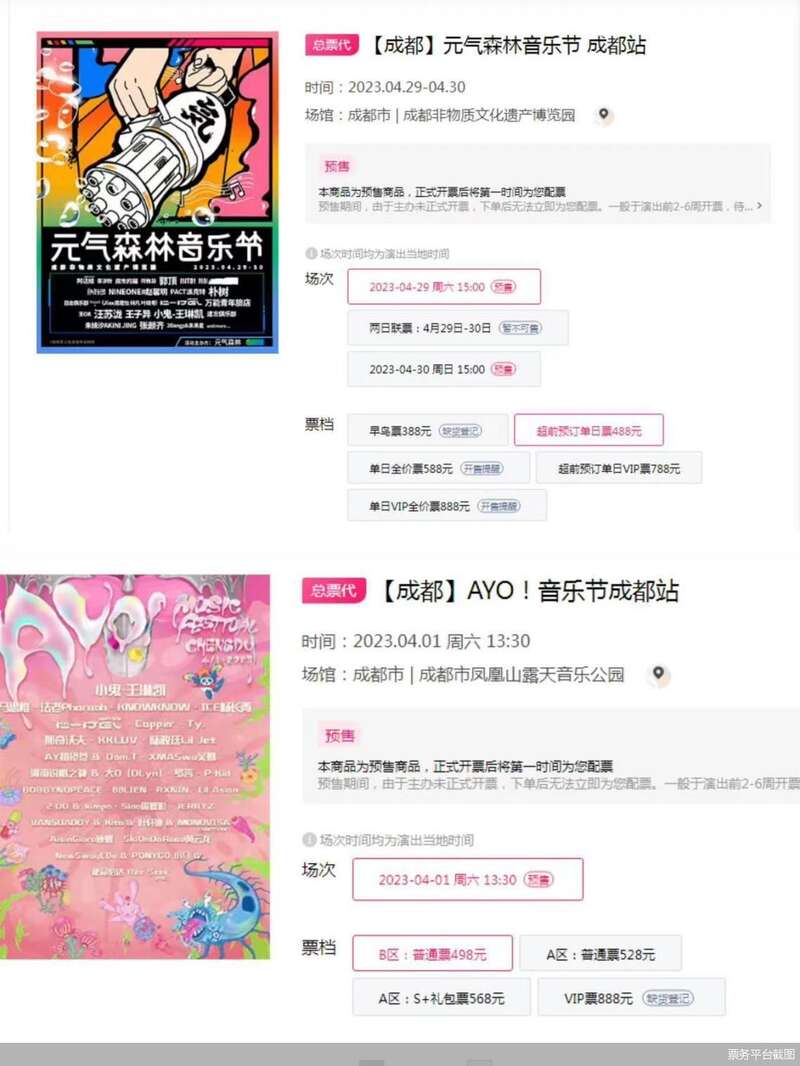 目前,AYO!音乐节成都站、2023西安草莓音乐节、元气森林音乐节等演出已出现部分档位门票售罄。