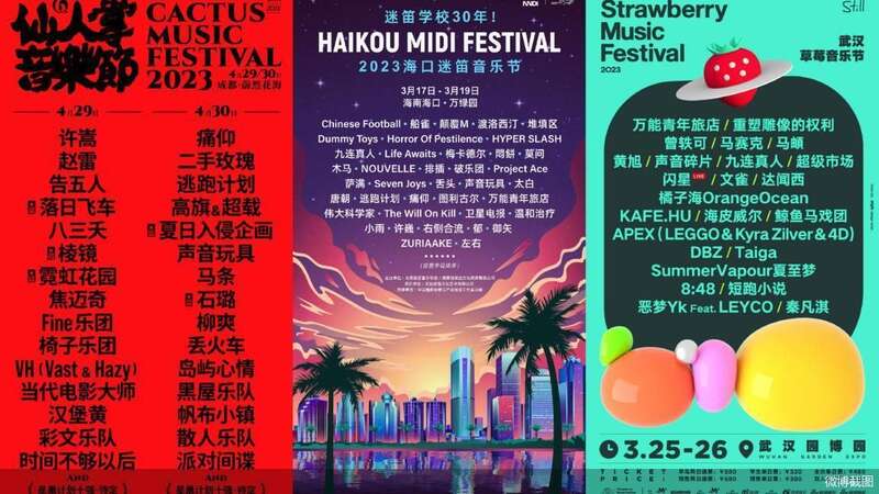与此同时,北京商报记者也注意到,定档4-5月的音乐节多数选择了二三线城市作为举办地,截至发稿,北京还未有大型露天音乐节的开票信息。不过草莓音乐节曾公开表示,2023草莓音乐节上半年的计划城市包括北京。单蔚也在采访中透露,北京、上海、深圳等一线城市的迷笛音乐节在洽谈和筹备中。