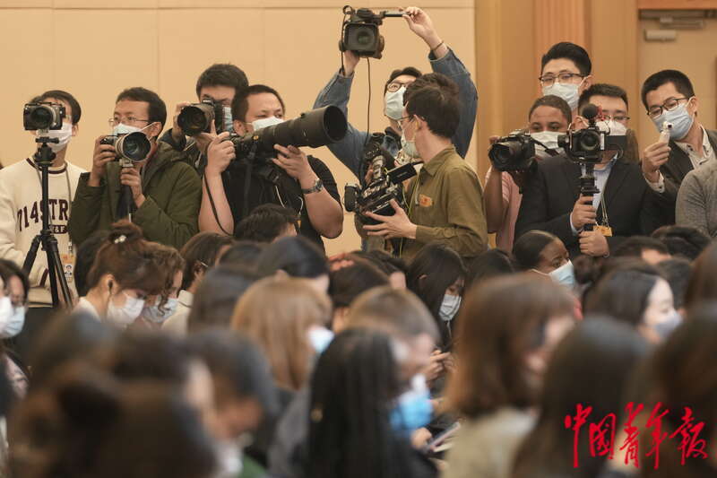 3月7日,北京梅地亚中心,十四届全国人大一次会议记者会上,现场的中外记者们。中青报·中青网记者 李隽辉/摄