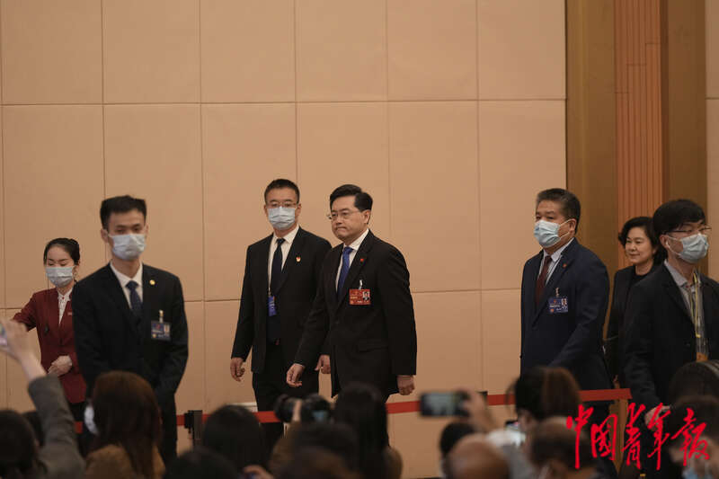 3月7日,北京梅地亚中心,十四届全国人大一次会议记者会上,外交部长秦刚(中)步入会场。中青报·中青网记者 李隽辉/摄