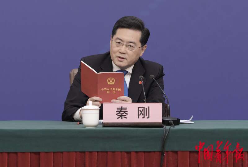 3月7日,北京梅地亚中心,十四届全国人大一次会议记者会上,外交部长秦刚回答有关台湾的问题时,拿出一本《中华人民共和国宪法》,并引用了序言里的两句话:“台湾是中华人民共和国的神圣领土的一部分。完成统一祖国的大业是包括台湾同胞在内的全中国人民的神圣职责。”当日,外交部长秦刚就“中国外交政策和对外关系”相关问题回答中外记者提问,这是秦刚就任外交部长后首次参加全国两会记者会。中青报·中青网记者 李隽辉/摄
