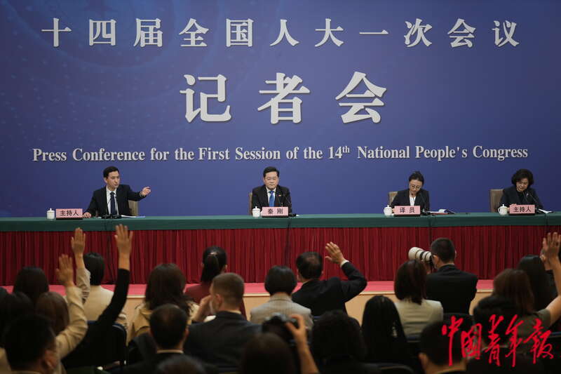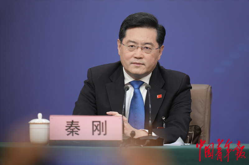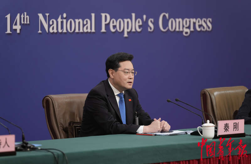 3月7日,北京梅地亚中心,十四届全国人大一次会议记者会上,外交部长秦刚在回答记者提问。中青报·中青网记者 李隽辉/摄