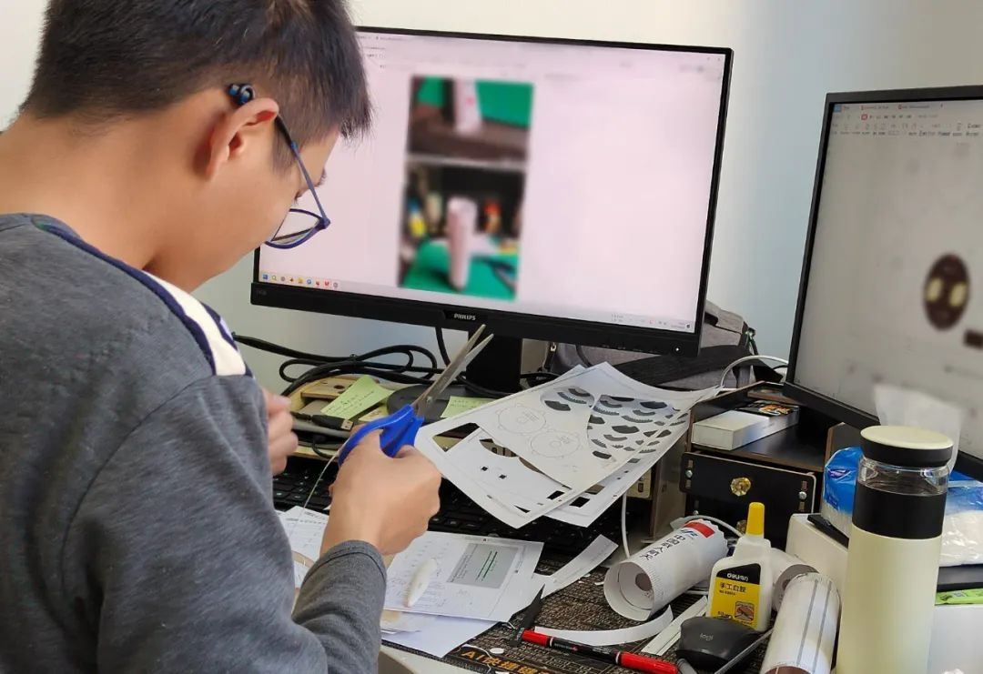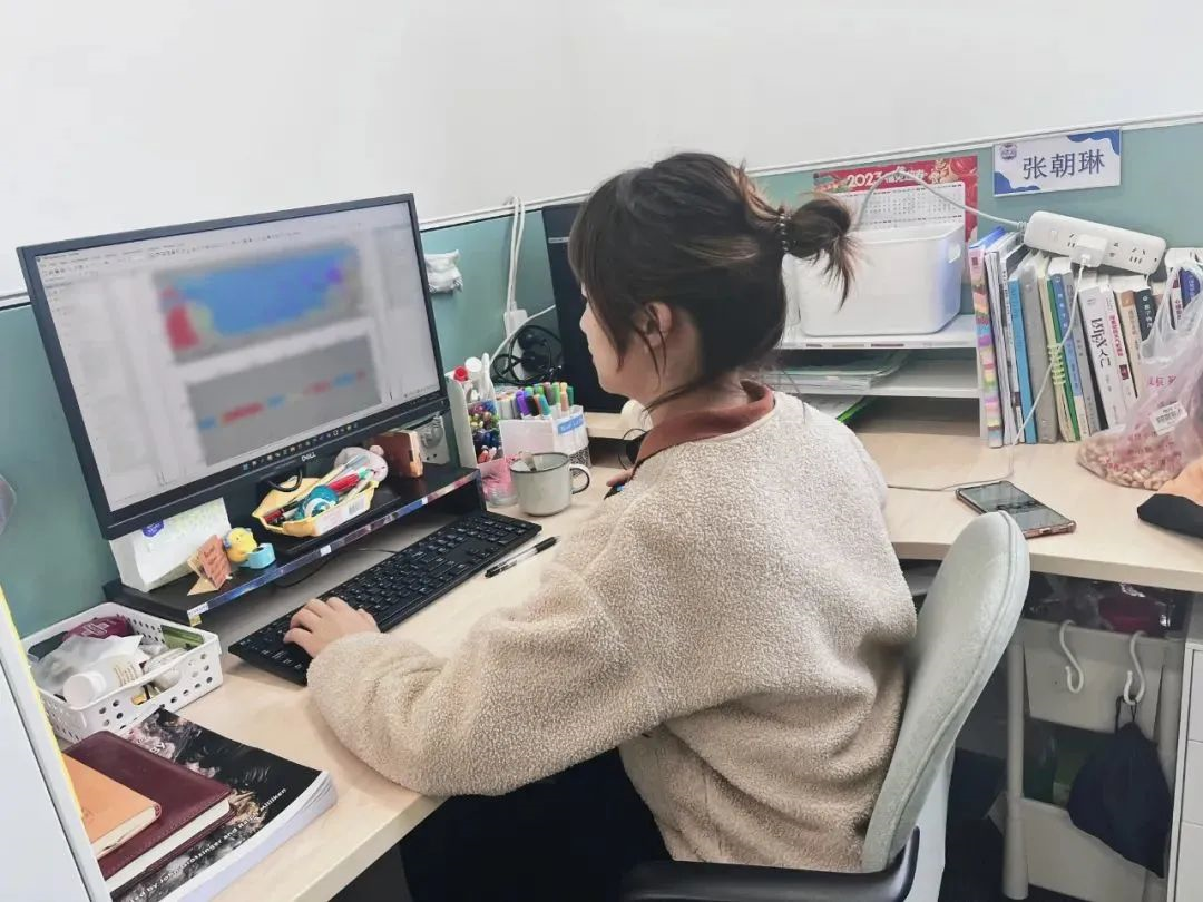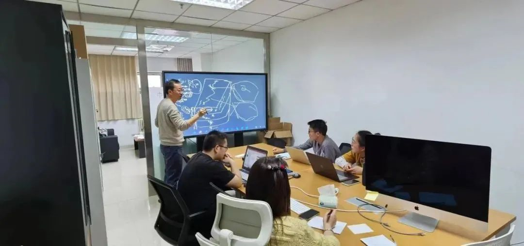 集中攻坚的战场就是刘洋的办公室,较大的外间里放着投屏电视和一张大办公桌,师生围坐在一起指导请教,分工协作、随时沟通、头脑风暴。