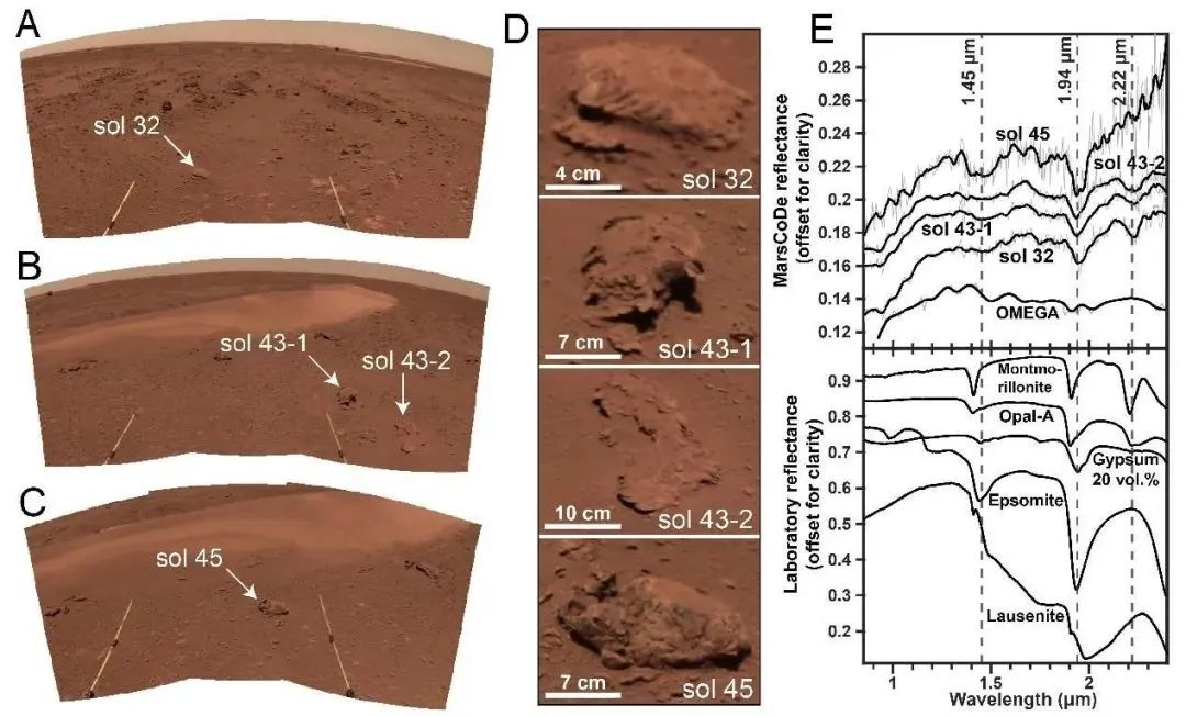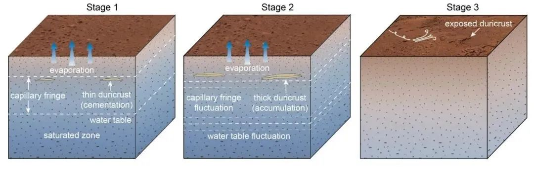 根据岩石对光谱的吸收特征推测,这种特殊的亮色岩石里含有水硅或含水硫酸盐,在此基础上,团队提出了亮色岩石的形成机制:沉积期前的土壤风化层在富含盐类的地下水上升或渗透期间,经历了胶结和岩化作用,形成了观察到的板状岩石。