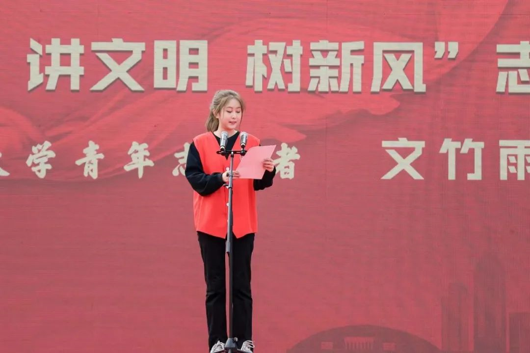 在3月1日举办的宁波市学雷锋志愿服务主题月启动仪式上,文竹雨代表宁波大学青年志愿者积极倡议: 号召全市青年志愿者“迎亚运、讲文明、树新风”,为亚运会贡献青春志愿力量!