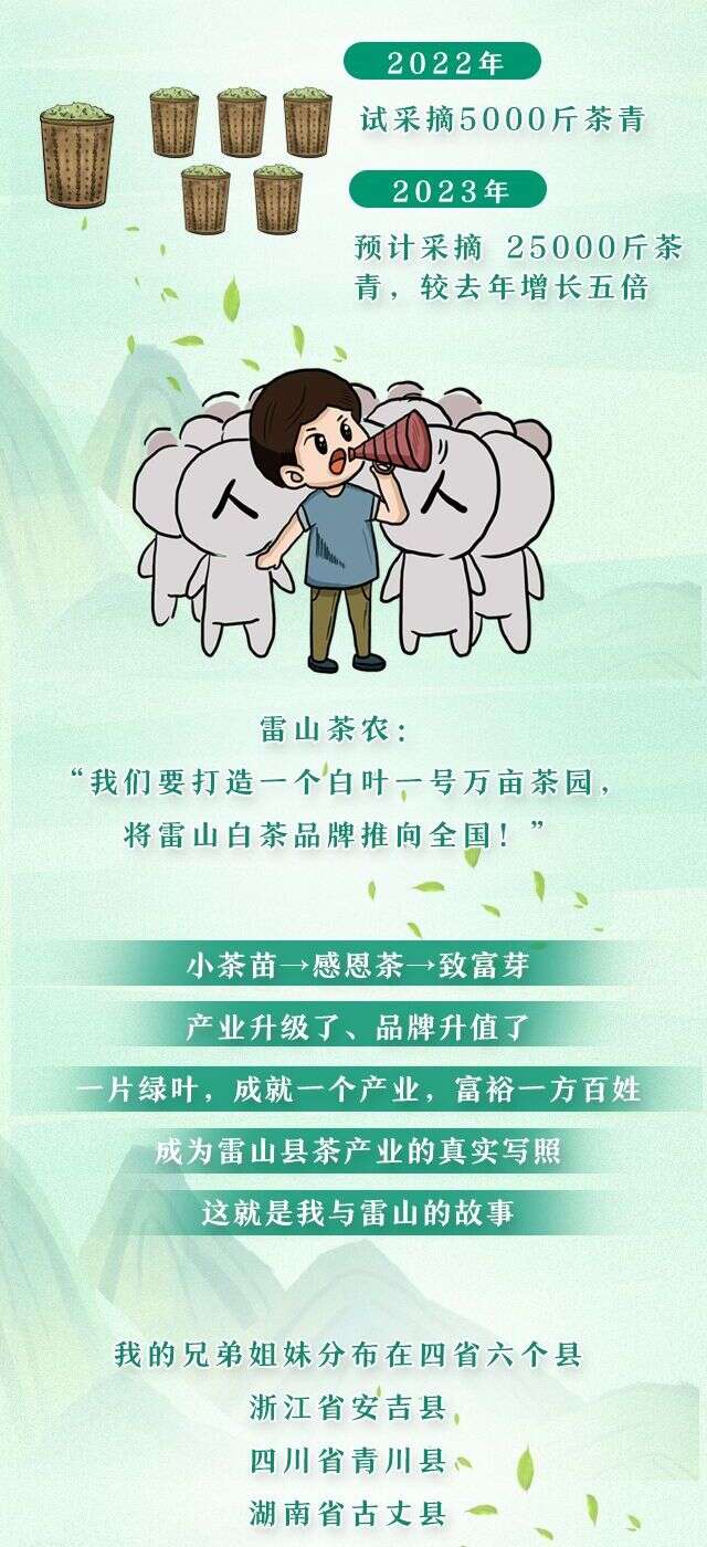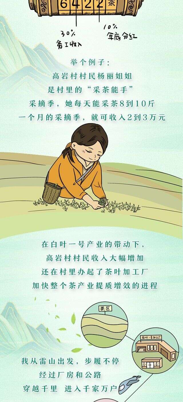 一片叶子,富了一方百姓。2018年4月,浙江省安吉县黄杜村20名党员给习近平总书记写信,汇报种植白茶致富的情况,并表达捐赠1500万株茶苗帮助贫困地区群众脱贫的心愿。习近平总书记作出重要指示强调,“增强饮水思源、不忘党恩的意识,弘扬为党分忧、先富帮后富的精神”。