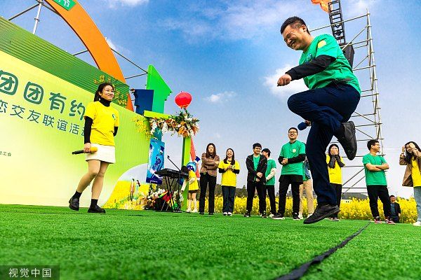 2023年3月12日,江西吉安,在吉水县乌江镇千亩油菜花基地,“相逢花海 团团有约”2023年吉安市单身青年联谊活动现场,朝气蓬勃的年轻人正在表演自编自导的节目。图片来源:视觉中国