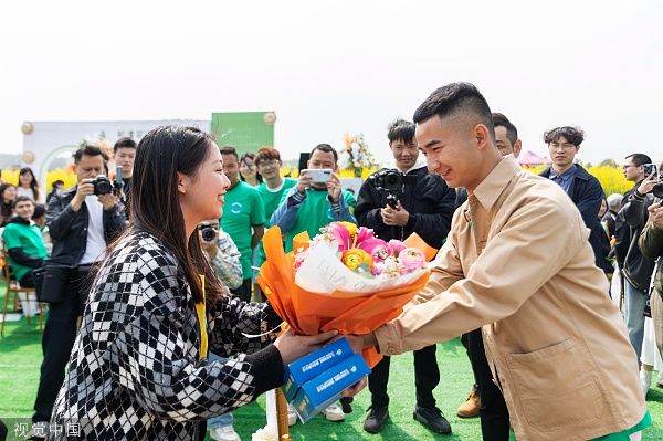 2023年3月12日,江西吉安,在吉水县乌江镇千亩油菜花基地,“相逢花海 团团有约”2023年吉安市单身青年联谊活动现场,一位男生为心仪的女生献上鲜花。图片来源:视觉中国