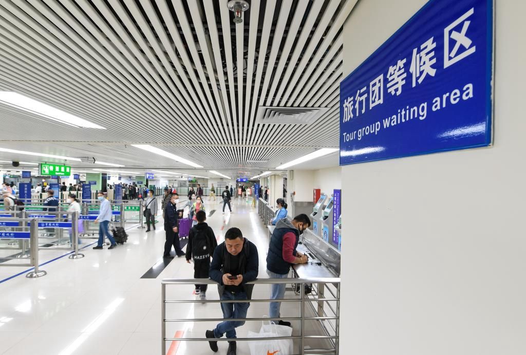 罗湖口岸入境检查大厅,“旅行团等候区”标识显眼,相关信息采集及入境填卡台人头攒动。有执勤移民管理警察正为外国旅客提供咨询指引。