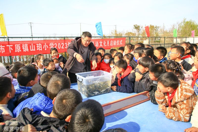 2023年3月16日,江苏南通,在如皋市下原镇山珀小学,老师向学生普及《长江保护法》。