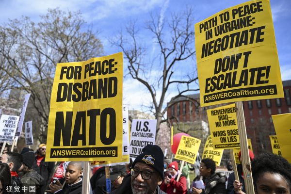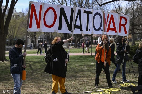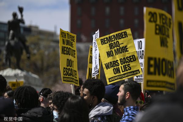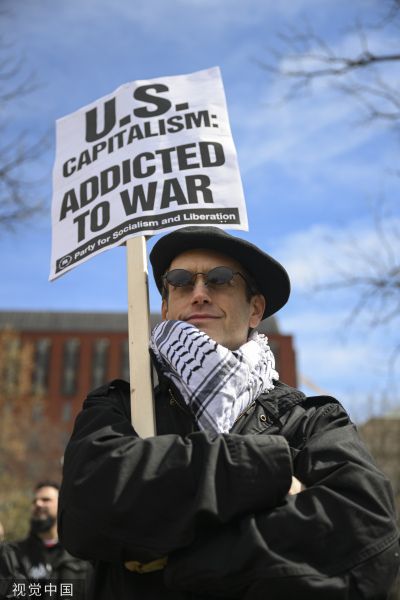 当地时间2023年3月18日,美国华盛顿特区,人们聚集在白宫附近举行反战示威游行。
